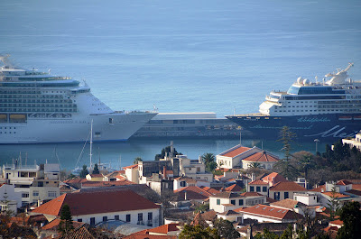 O navio da Royal Caribbean, INDEPENDENCE OF THE SEAS e o da TUI Cruises, MEIN SCHIFF 1, são presenças habituais no porto do Funchal neste período de Inverno, mas ainda esta temporada não haviam estado os dois ao mesmo tempo. Linda combinação de 2 navios virados um para outro de proa para proa a embelezar esta baía do Funchal, que conta com 5524 passeigeiros em transito (3600 do IOTS e 1924 do Mein Schiff).